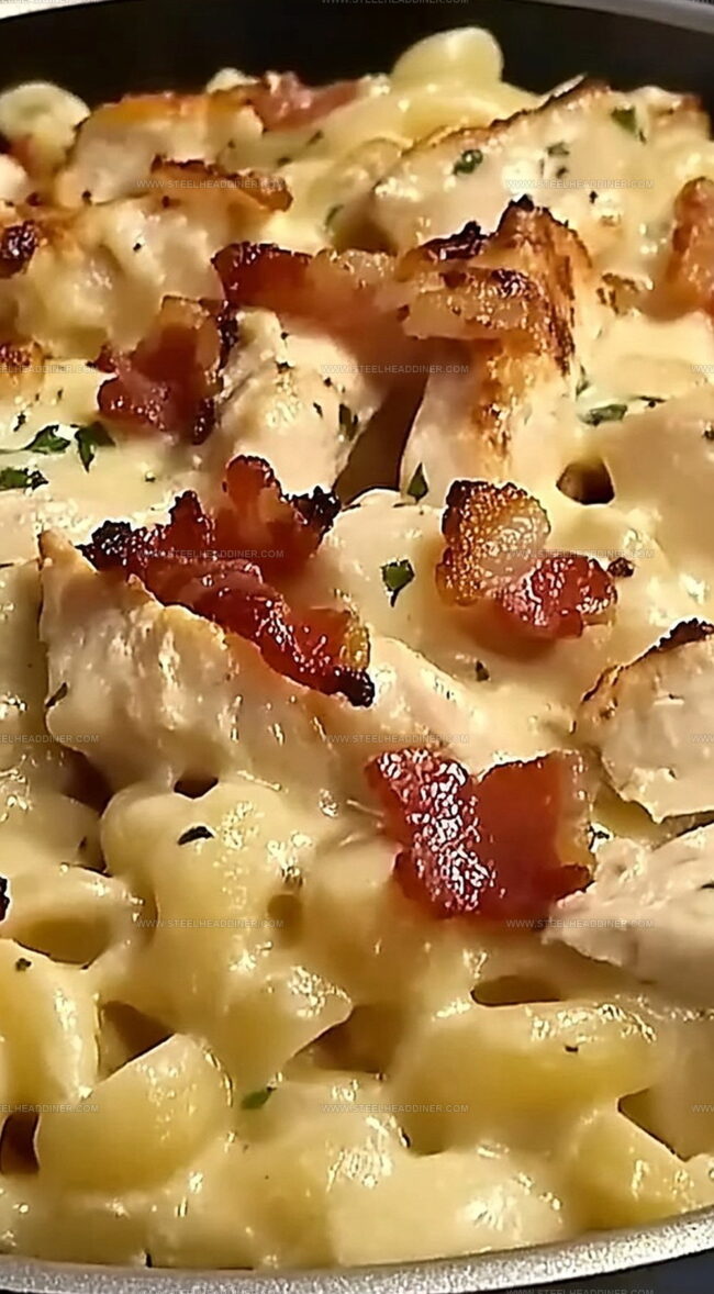 Crispy bacon bits dance alongside tender chicken chunks in a creamy sauce.
