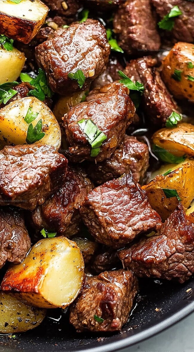 Sprinkle freshly chopped parsley over the beef and potatoes just before serving, adding a vibrant touch of color and fresh herb flavor.