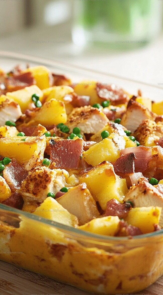 Comfort meets indulgence in this loaded chicken and potato casserole that promises a hearty meal for hungry souls.