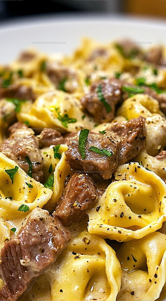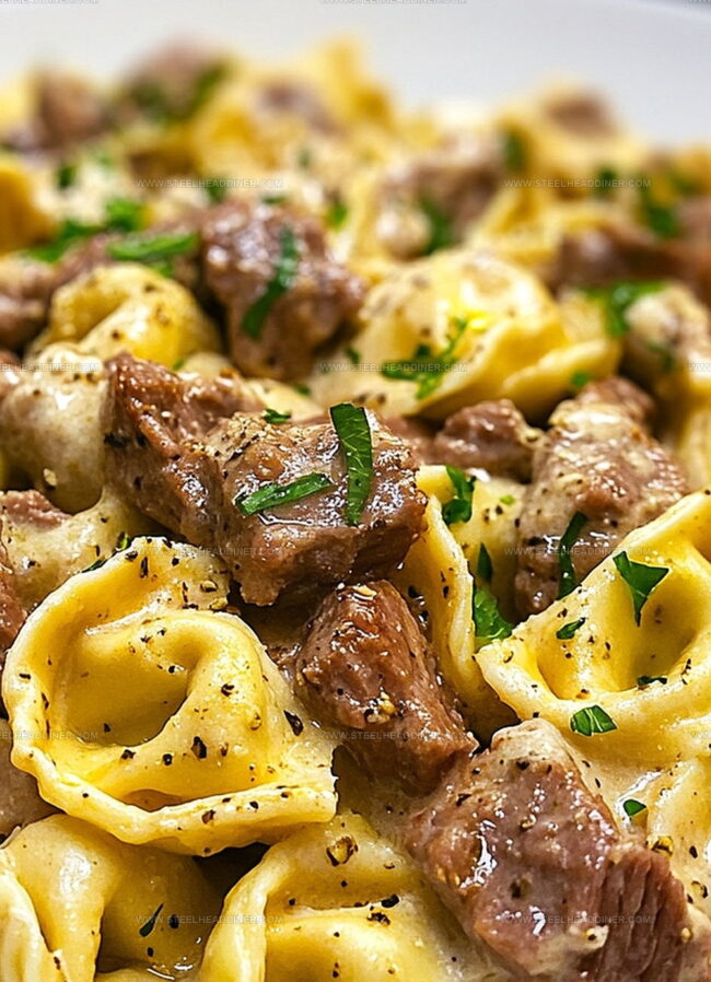 Juicy steak strips mingle with melted provolone, creating a creamy sauce that clings perfectly to each tortellini.