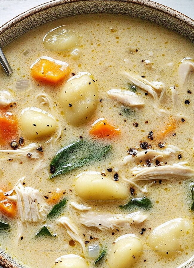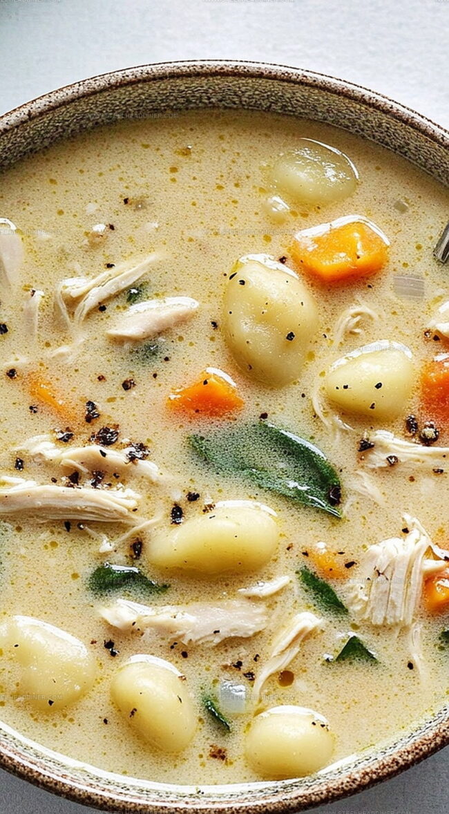 - Ladle the creamy, herb-infused soup into warm bowls, capturing the perfect blend of tender chicken, soft gnocchi, and aromatic vegetables.