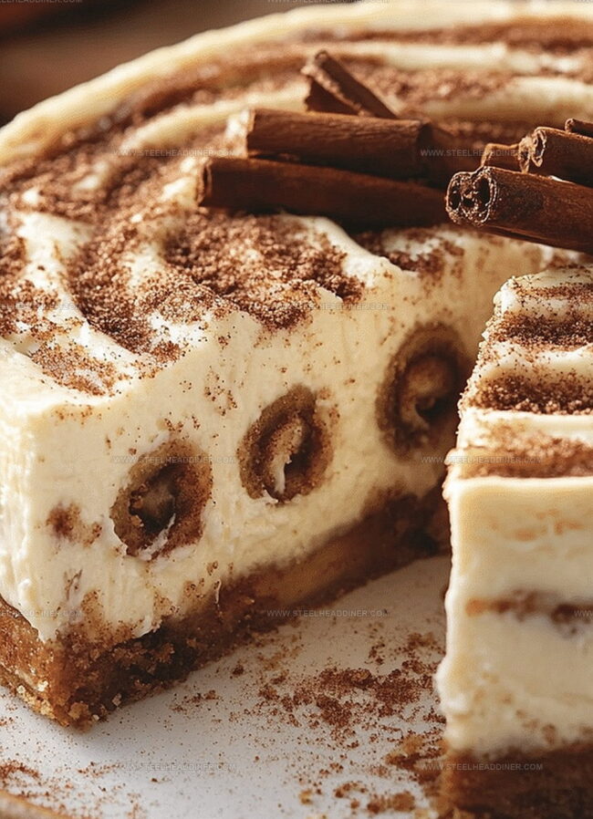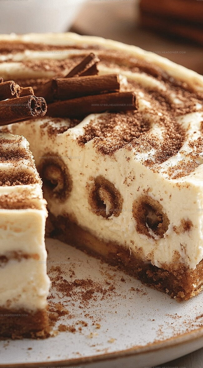 Drizzle the reserved cinnamon roll icing sparingly to prevent overwhelming the delicate cheesecake flavor. Ensure cream cheese is at room temperature for smoother, lump-free filling that blends perfectly. Gently swirl the cinnamon mixture using a knife in light, zigzag motions to create beautiful marble patterns without disturbing the cheesecake base. Allow the cheesecake to cool completely at room temperature before refrigerating to prevent cracking and maintain a silky texture. Test the cheesecake’s doneness by gently shaking the pan – a slight wobble in the center indicates it’s perfectly baked and will set while cooling.