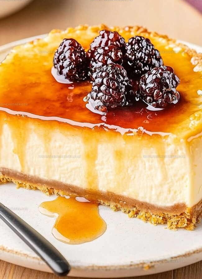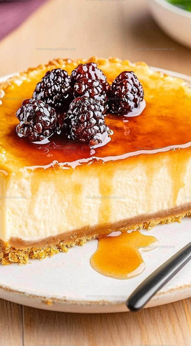 - Before serving, generously sprinkle a thin, even layer of granulated sugar across the cheesecake’s surface. Use a kitchen torch to caramelize the sugar, moving continuously until it transforms into a crisp, golden-brown crust that shatters beautifully when tapped.