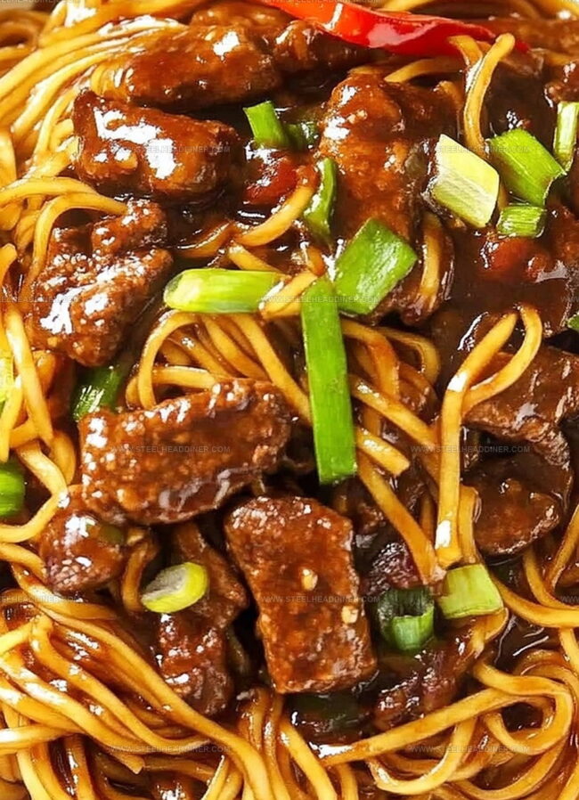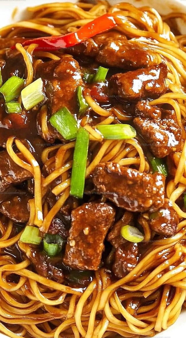 The sauce combines soy sauce, hoisin sauce, oyster sauce, brown sugar, and sesame oil, creating a perfect balance of sweet, salty, and umami flavors that coat the beef and noodles.
