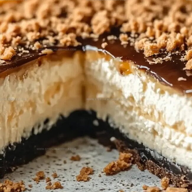 Spread this mixture evenly across the chilled cheesecake. Drizzle chocolate and additional caramel sauces over the top for extra indulgence.