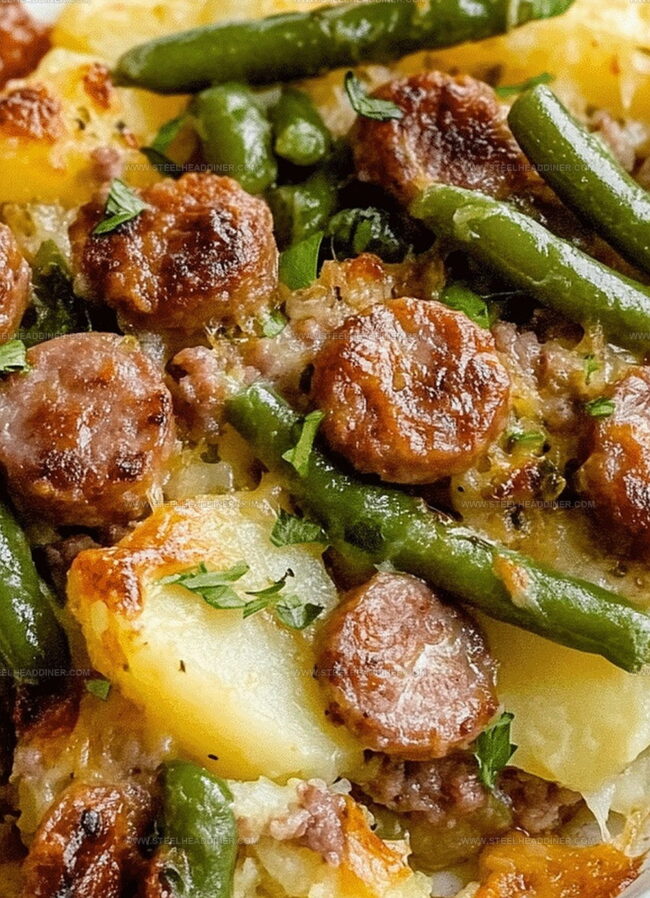 Hearty sausage green bean potato casserole combines rustic comfort with simple midwest flavors. Savory ingredients merge in one-pan ease, promising delicious satisfaction for family dinner gatherings.